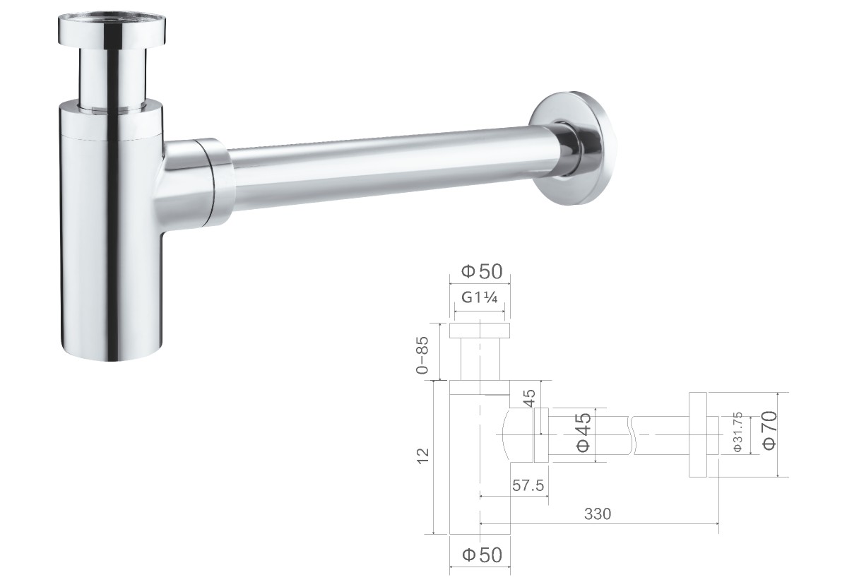 Цинковый круглый сифон с черной лакировкой 1 1/4"